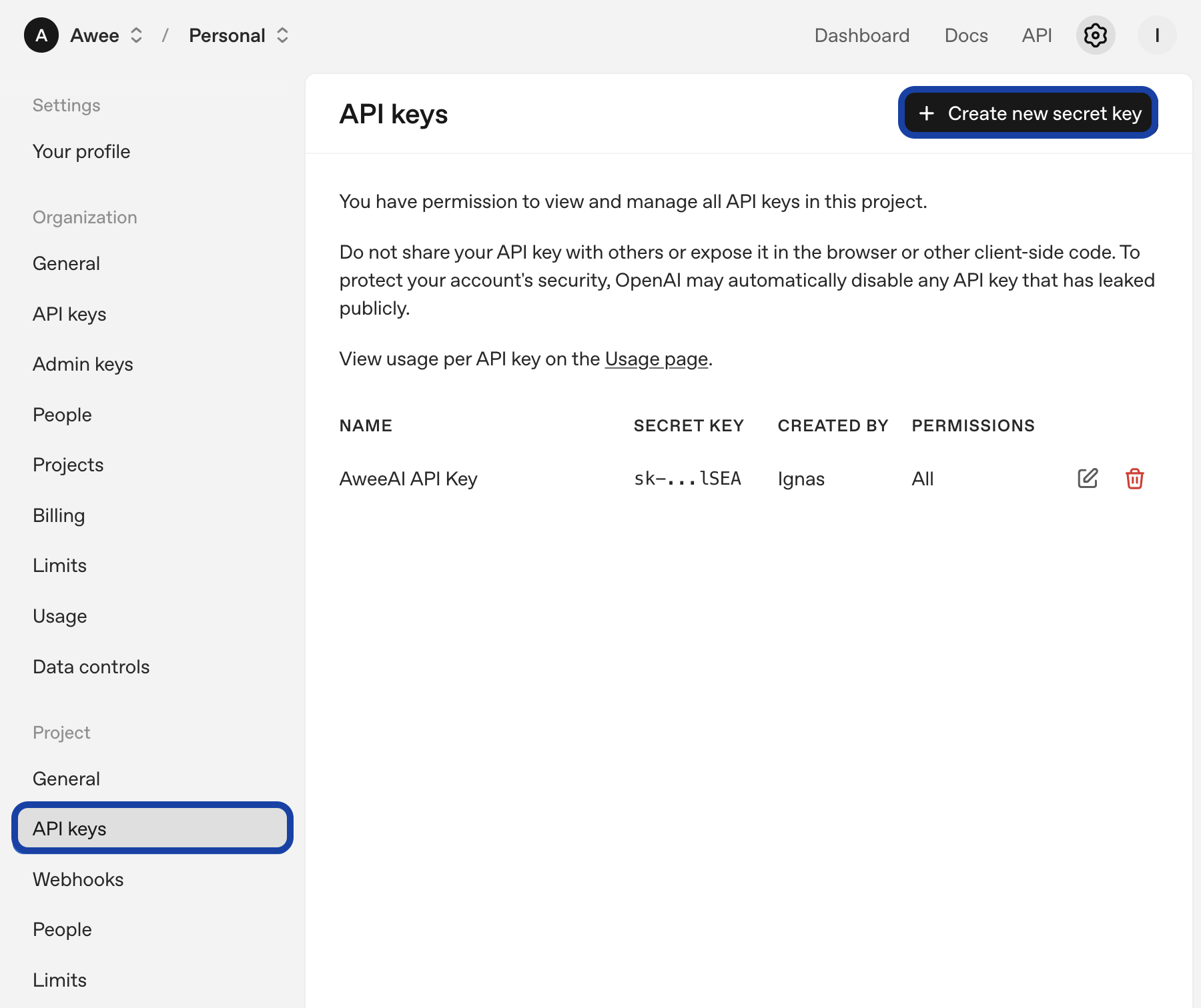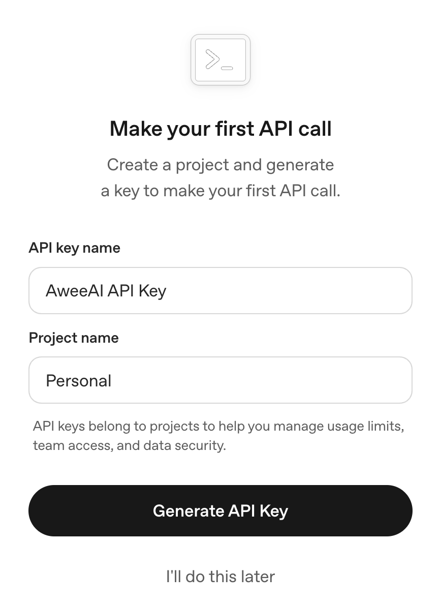 Enter the name for the API key (something related to Awee) and a project name (Personal, Specific Project A, Food with AI, etc.).