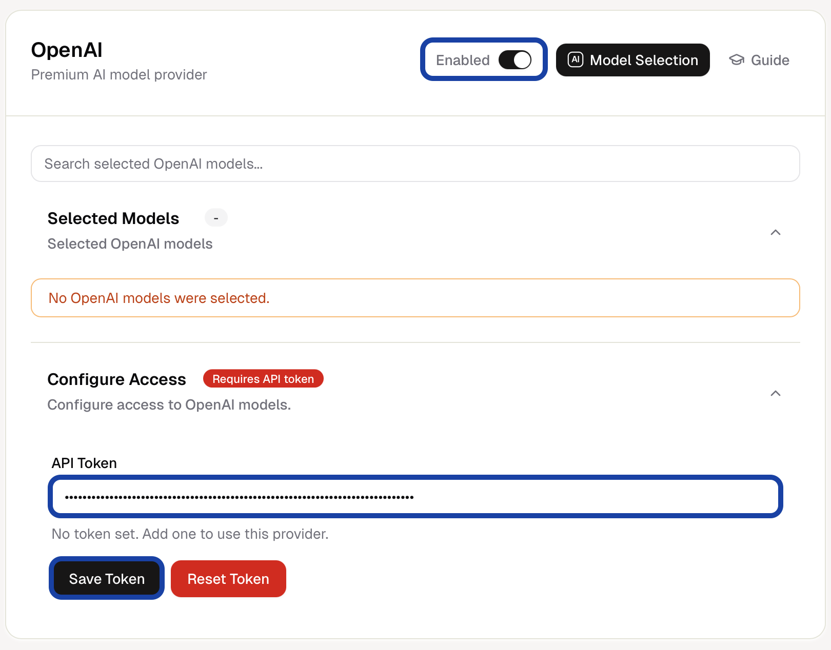 In Awee Desktop, go to Awee Desktop Settings. Make sure the OpenAI provider is enabled, paste in the token and click "Save Token". Click to open in-app Awee Settings.