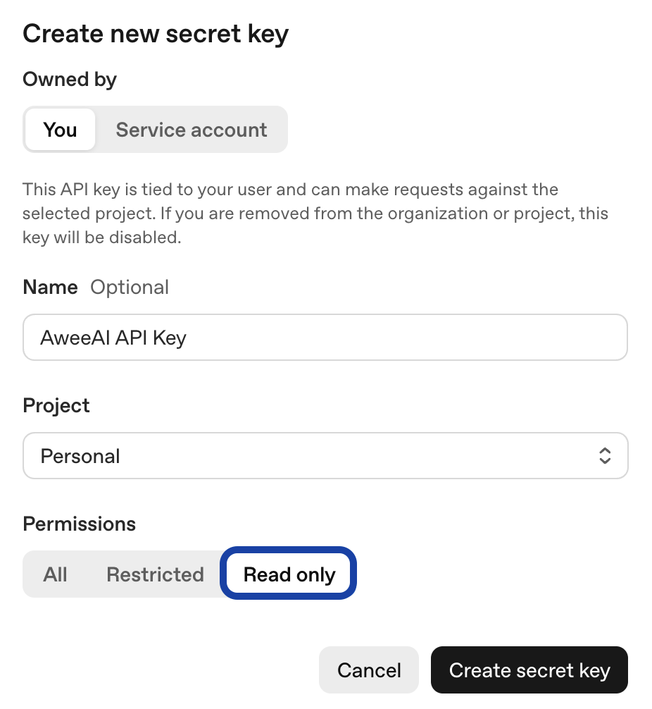 You can select the "Read Only" permission as Awee doesn't perform any operations except for AI communication.